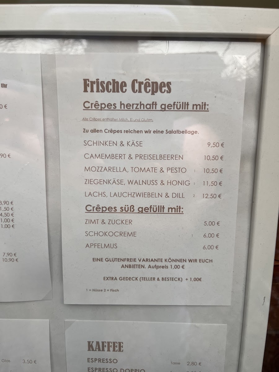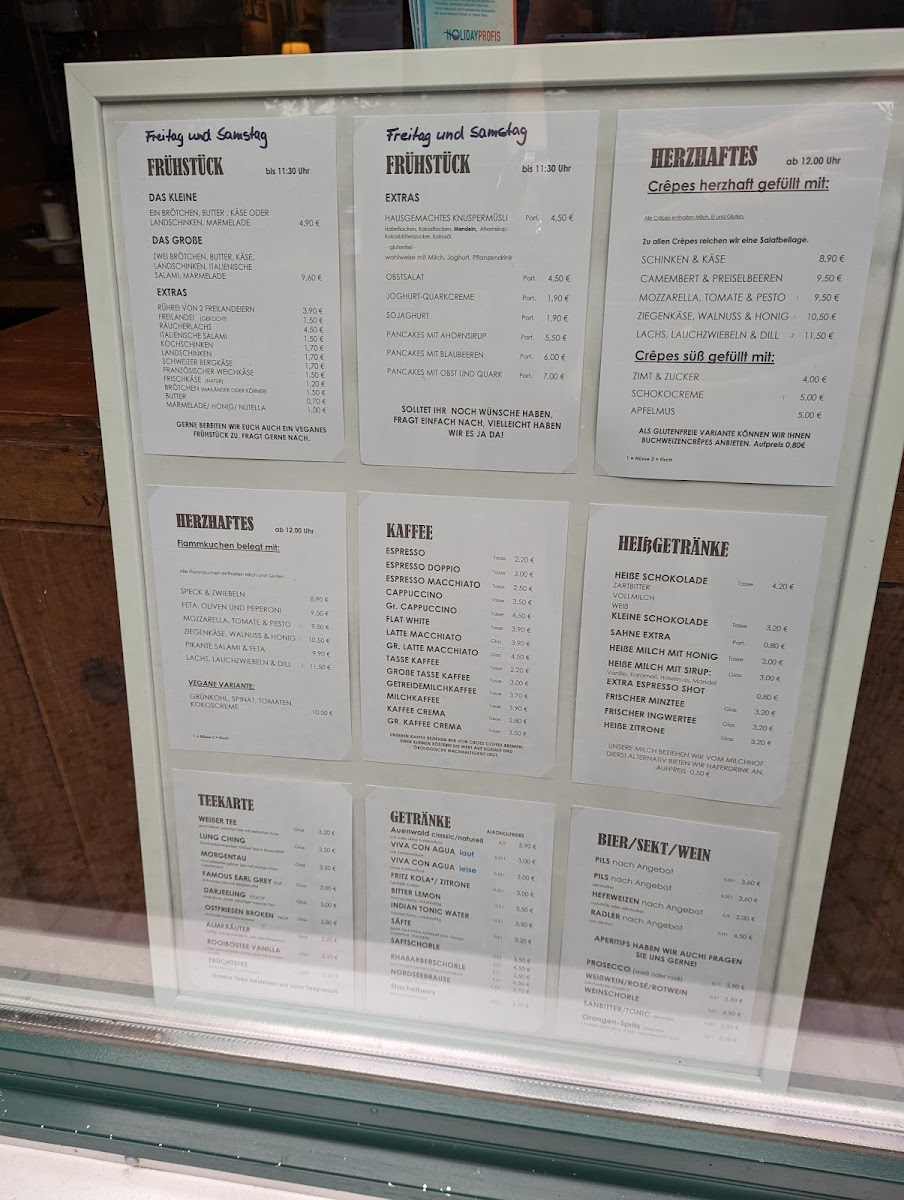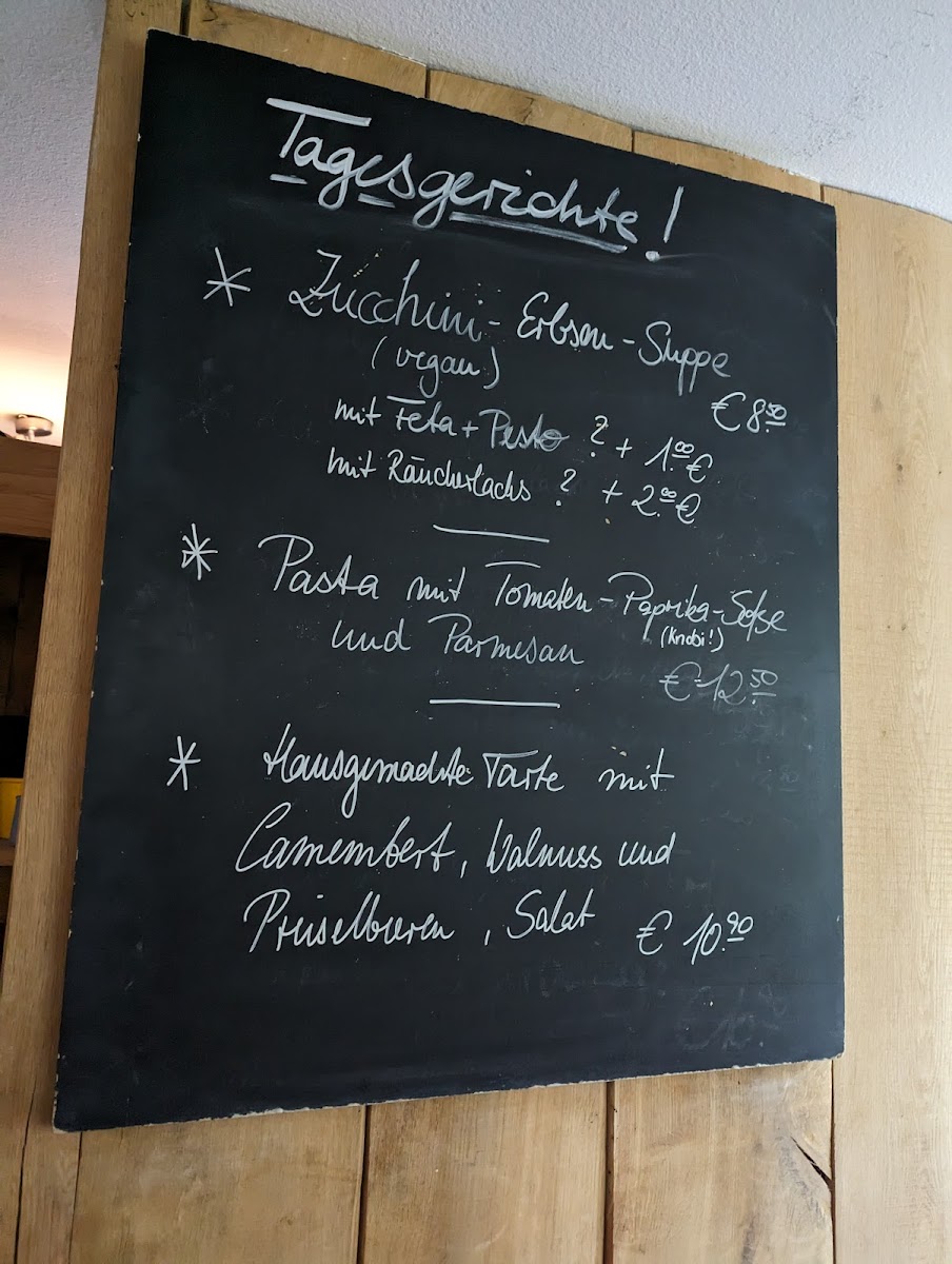 - Desserts and pastries: A range of cakes, tarts, and pastries can be found, including crêpes with tuna, raspberry mint specialties, strawberry cake, apple strudel, baked apple punch, chocolate tarte, lemon cake, Donauwelle, and various tarts.