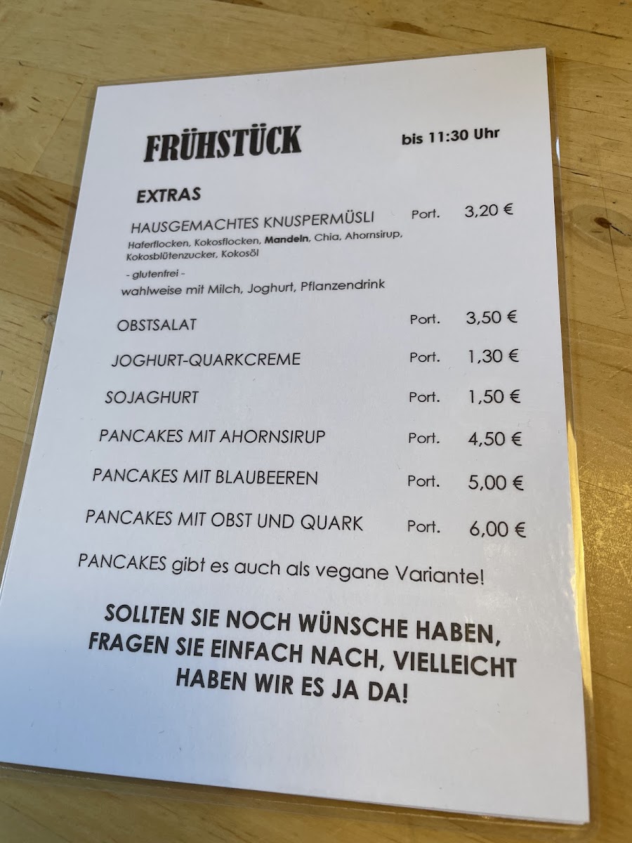 The menu at Espressobar Kaffeekunst features a selection of coffee and café offerings suitable for various times of the day, including breakfast, light meals, and coffee breaks. The available items can be broadly categorized into beverages, breakfast options, savory dishes, and desserts.